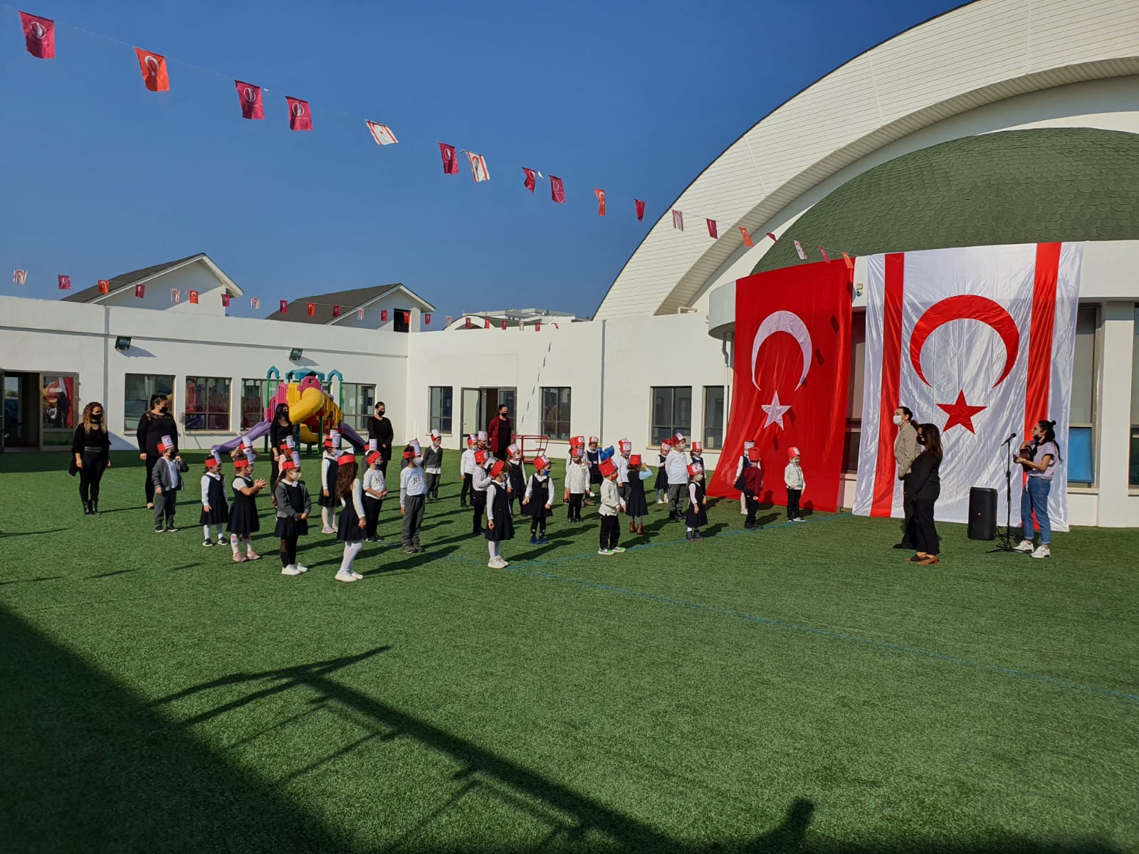Yakın Doğu Okul Öncesi Lefkoşa şubesinde, Kuzay Kıbrıs Türk Cumhuriyeti’nin 37. Yılı kutlama töreni yapıldı. Günün temasına göre panolar oluşturuldu. Şarkılar ve şiirler söylendi.